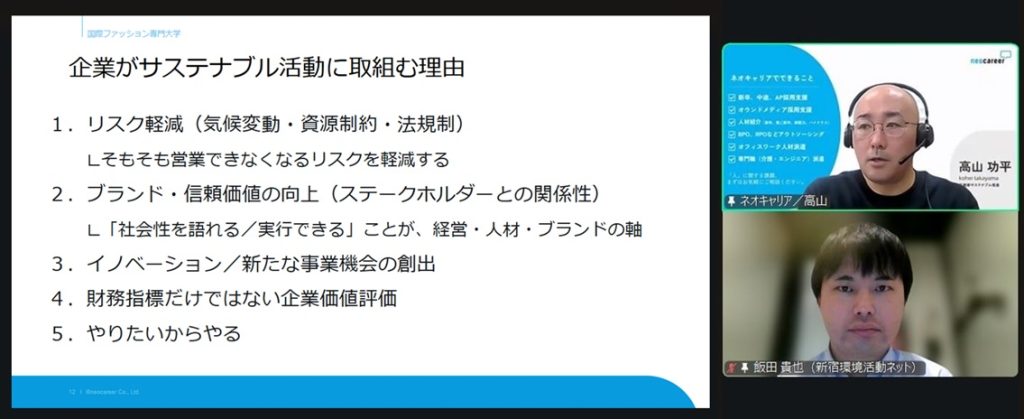 冒頭では、当社の事業概要を紹介した上で、なぜ今、企業がサステナブル活動に取り組む必要があるのかを、消費者の価値観の変化や社会背景とともに解説。さらに、財務情報だけでは測れない「非財務価値」の重要性に触れ、企業の信頼や共感、社会性が中長期的な企業価値につながることをお伝えしました。