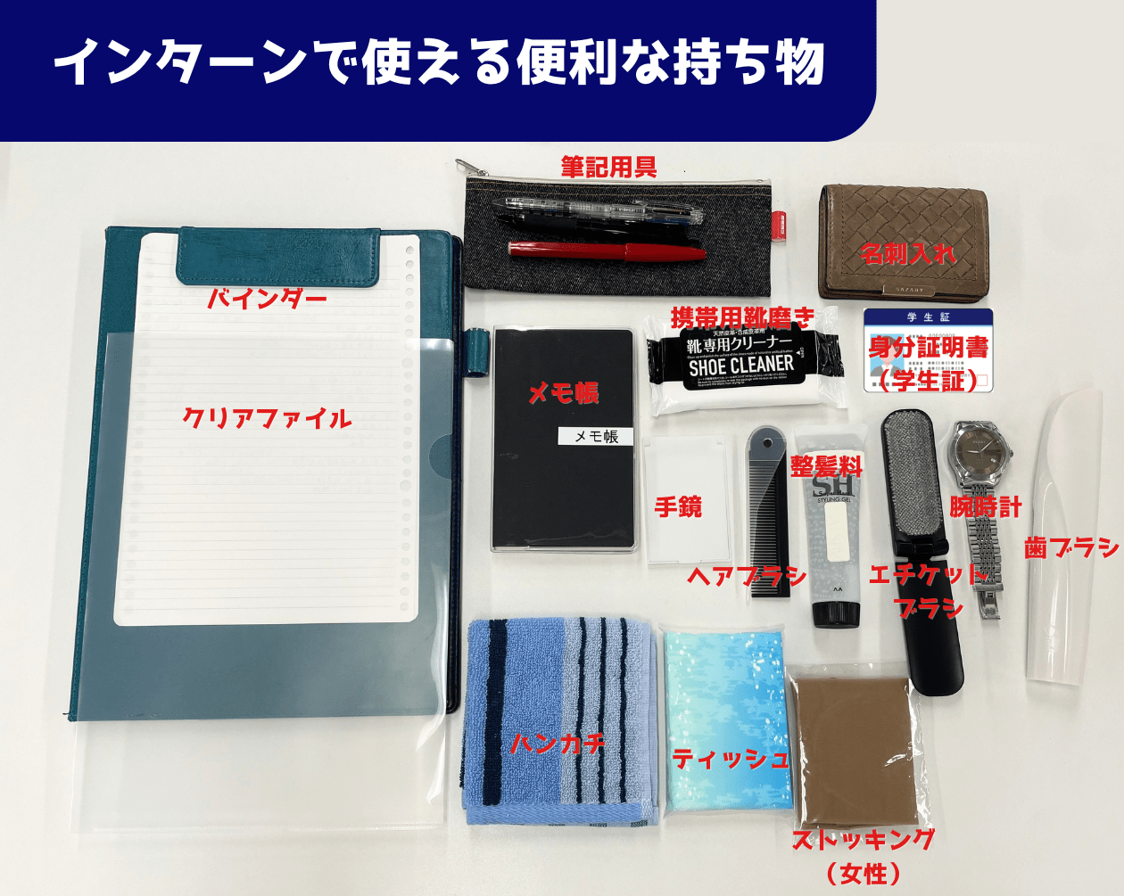 身だしなみは非常に大事です。身だしなみを揃えられるグッズは持っておくと良いでしょう。家で完璧に整えてきてもインターン先に着くまでに乱れたり、汚れたりすることもあるので、すぐに整えられるようにエチケットブラシ・整髪料・手鏡・ヘアブラシ・携帯用靴磨き・歯ブラシなどは持っておくと安心です。名刺入れ