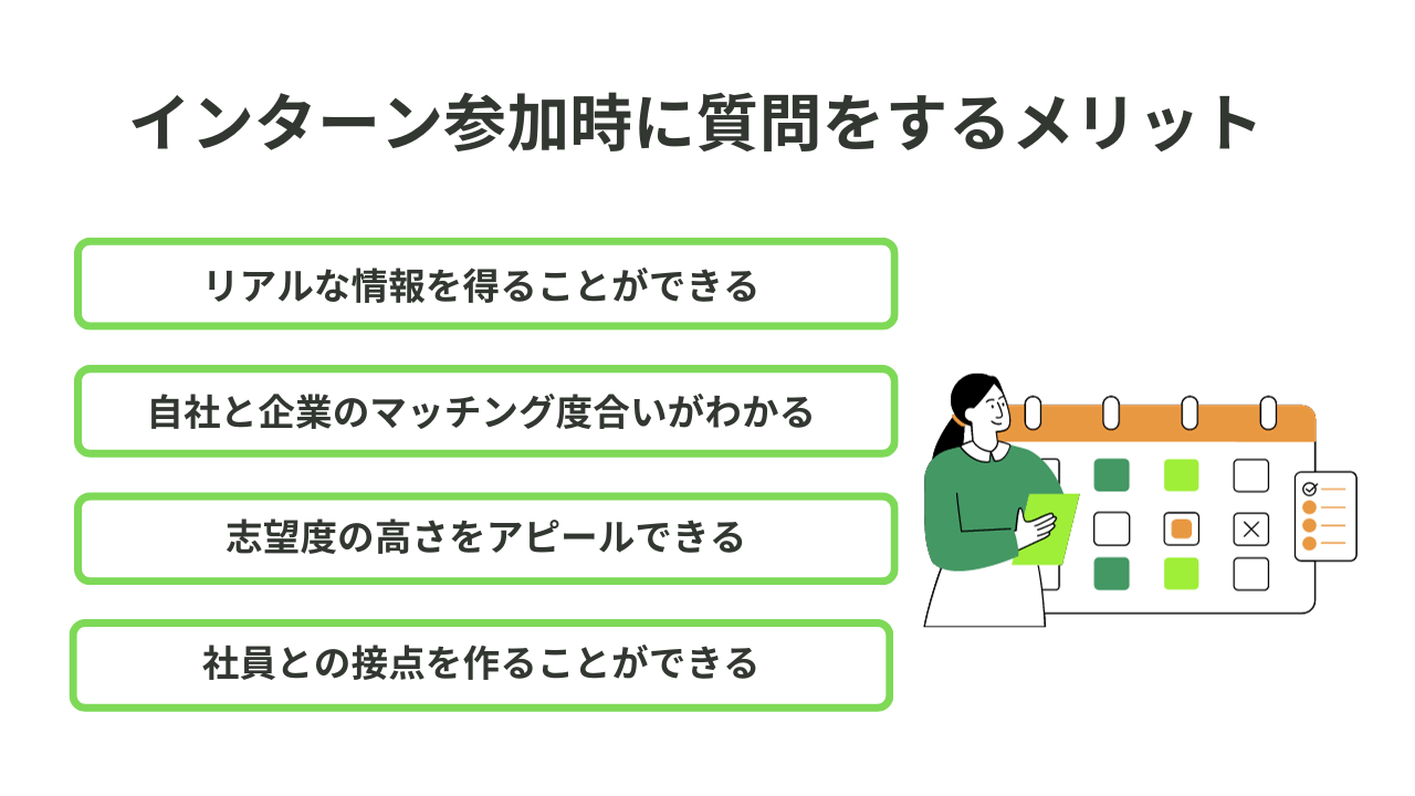 - インターンで質問するメリットは、「リアル情報の収集」「マッチング」「志望度アピール」「社員との関係構築」の4点