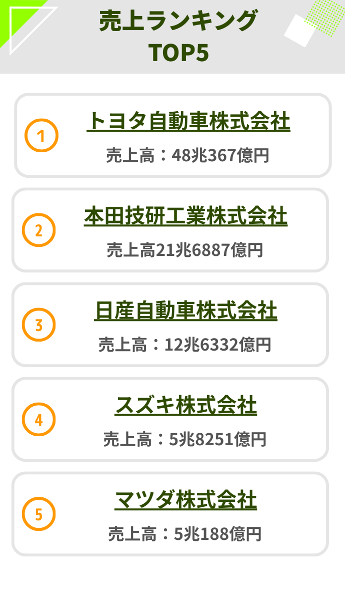 ここでは自動車業界の売上高ランキングを紹介します。企業選びの参考にしてみてください。