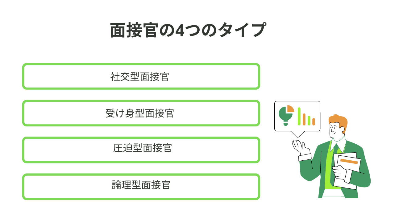 - 社交型、受け身型、圧迫型、論理型の4パターンの面接官の特徴を知っておく