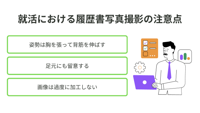 履歴書写真を撮影する際には表情や姿勢以外にも気を配る必要があります。そこでここでは証明写真を撮影する際に注意すべき点についてご紹介します。