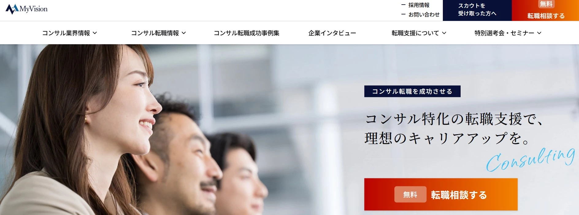 「MyVision」は戦略・総合・IT・シンクタンクなど、コンサル業界出身のキャリアアドバイザーが多数在籍するコンサル転職特化型の転職エージェントです。