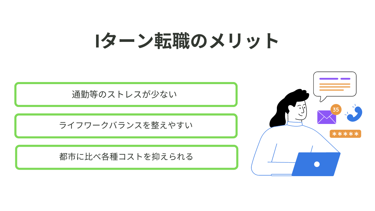 - 「Iターン転職」には、ライフワークバランスを整えやすい、各種コストを抑えられるなどのメリットがある