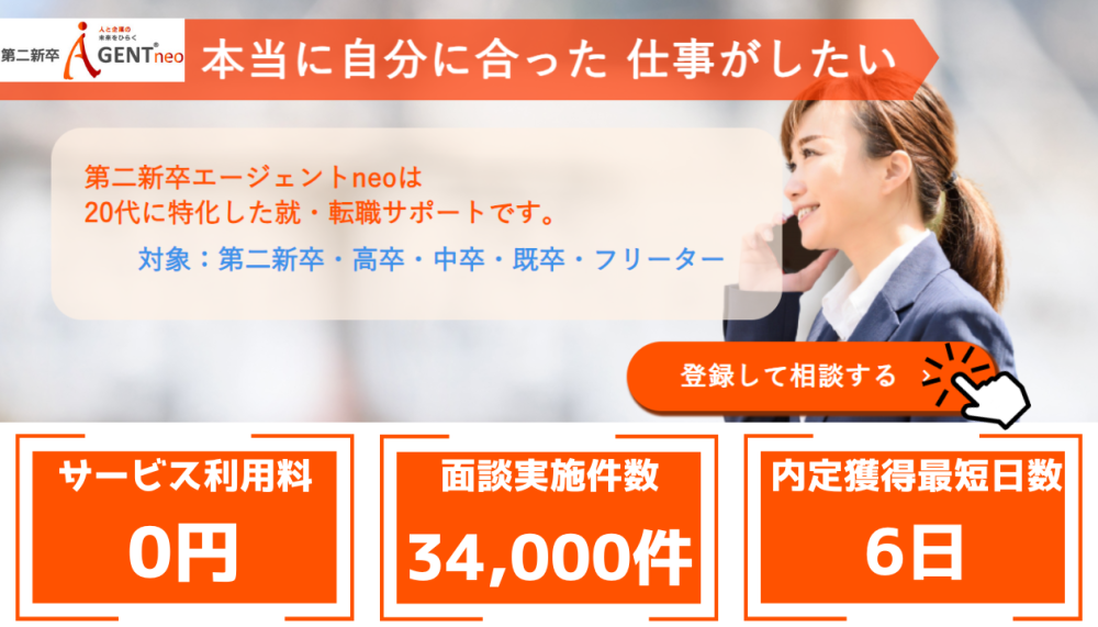 「第二新卒エージェントneo」は主に第二新卒など20代若手層に特化した転職エージェントです。