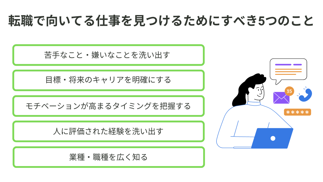 - 転職で向いてる仕事を見つけるためには、苦手なことの洗い出しや目標の明確化、モチベーションが高まるタイミングの分析などが必要
