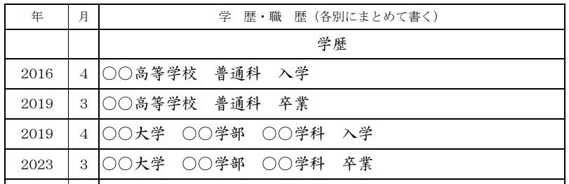 学歴は、高校入学から時系列に書きましょう。学歴が中学卒業までの方は、中学入学からで問題ありません。 ポイントは、学校名はもちろん、学部・学科名、専攻コース名を省略せず、正式名称で書くことです。よくあるのが「○○高校」と記載してしまう方がいますが、「○○高等学校」のように正式名称で書くようにしましょう。