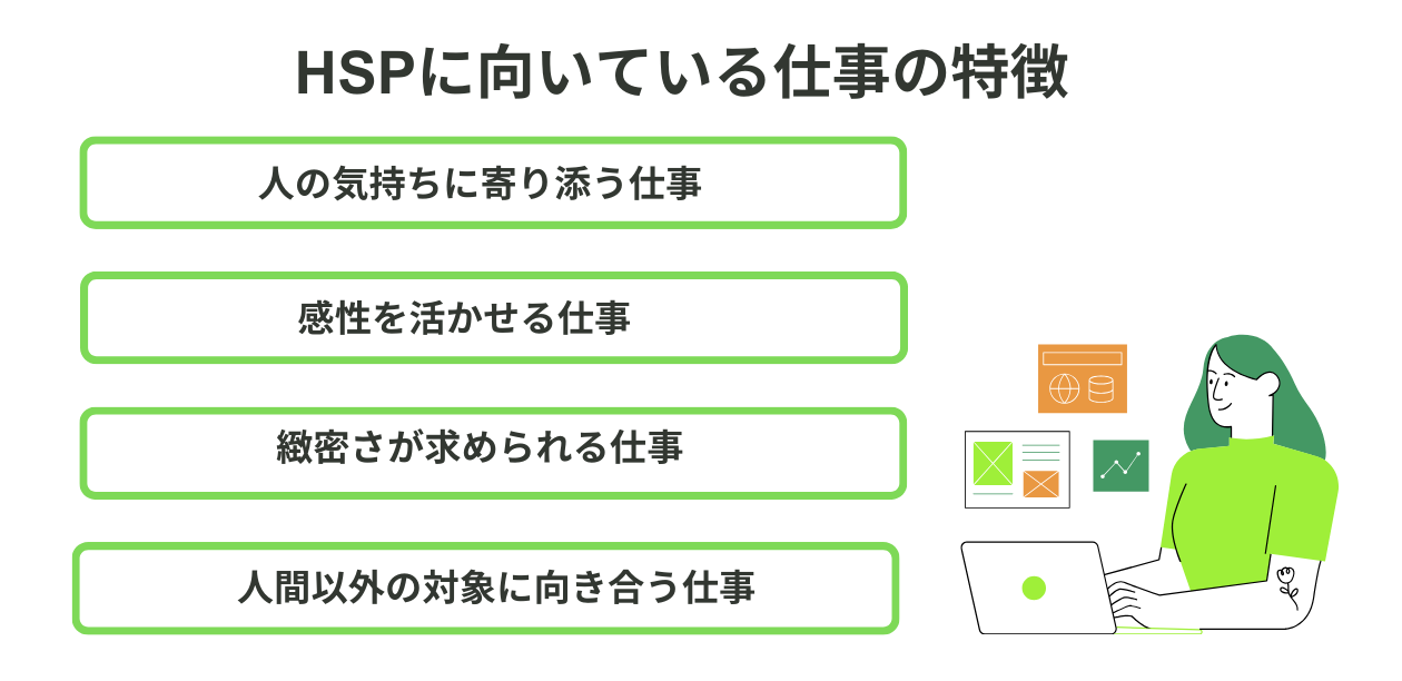 - HSPに向いている仕事は、「人の気持ちに寄り添う仕事」「感性を活かせる仕事」「緻密さが求められる仕事」「人間以外の対象に向き合う仕事」などがある