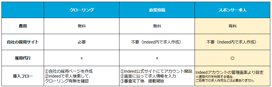 それぞれの掲載方法について下記の表にまとめましたので、ご参考ください。