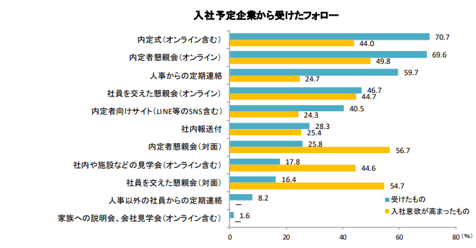 株式会社ディスコの調査によれば、企業から受けたフォローのうち、「社員を交えた懇親会(対面)」「内定者懇親会(対面)(オンライン)」は学生の約半数以上が入社意欲が高まったことがわかります。