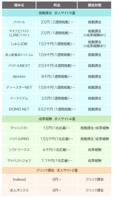 マイナビバイトやバイトルなど主要サイトの料金形態は掲載課金型にあたります。