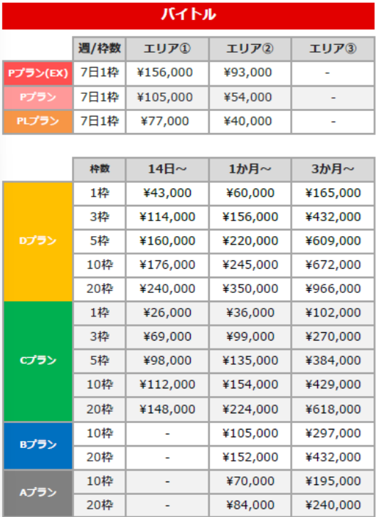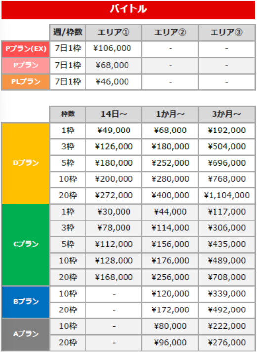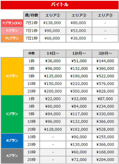 以下の料金表ではエリア、掲載期間、枠数ごとに金額をまとめています。
