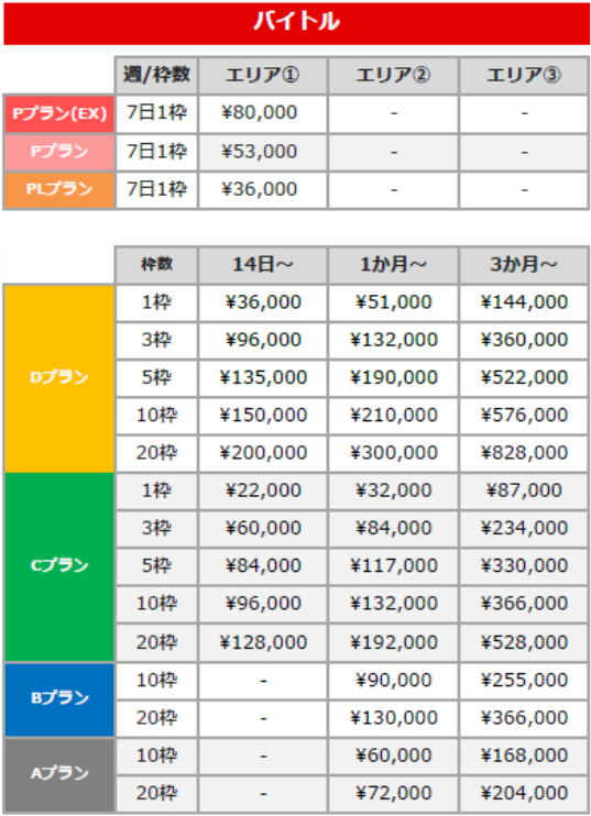 2.バイトルの掲載料金表|エリア・プラン別費用