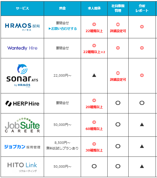 | サービス | 料金 | 求人媒体 | 社員権限 管理 | 分析 レポート | エージェント 管理 | 選考ステップ カスタム | 自動評価 リマインド | 管理画面 操作性 | カレンダー 連携 | ZOOM 連携 | Google Meet連携 | Teams 連携 | Indeed 連携 | 英語対応 | スマホ対応 |