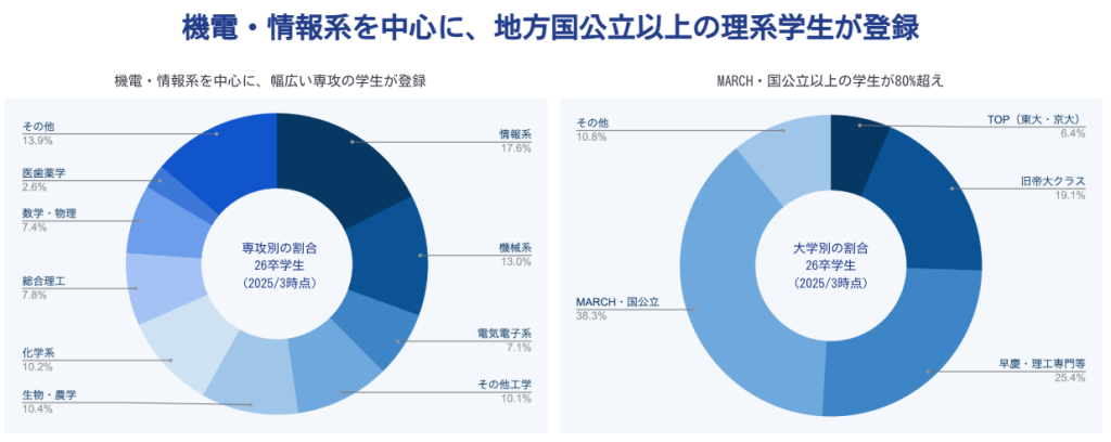 累計登録者数11万人以上を誇り、登録学生の約80%以上がMARCHや国公立以上の上位校出身者です。特に大学院生を中心とした機電・情報系の優秀層が多く集まっているため、質の高い母集団形成が可能です。