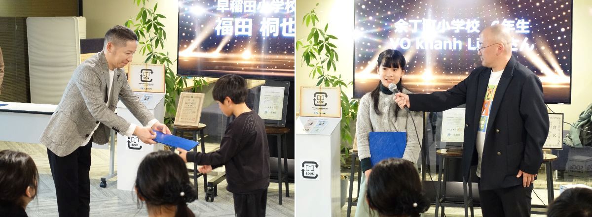 表彰式では、新宿環境活動ネット代表理事の飯田 貴也様より、5週間にわたり日記を書き続けた児童たちの努力を称える開会のご挨拶をいただきました。続いて、当社サステナブル推進担当の高山が各作品の選考ポイントを紹介し、代表取締役CEOの西澤が受賞者へ賞状を授与しました。