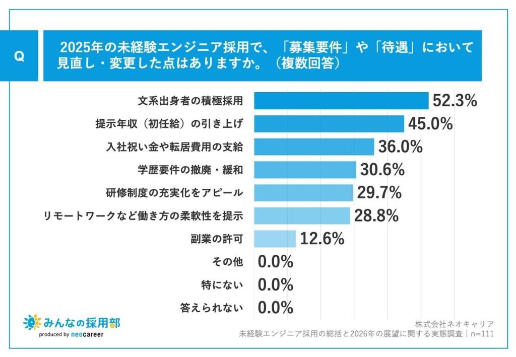 2025年の未経験エンジニア採用において、「募集要件」や「待遇」で見直し・変更した点について尋ねたところ、「文系出身者の積極採用」が52.3%で最多となりました。次いで、「提示年収(初任給)の引き上げ」が45.0%、「入社祝い金や転居費用の支給」が36.0%という結果となりました。