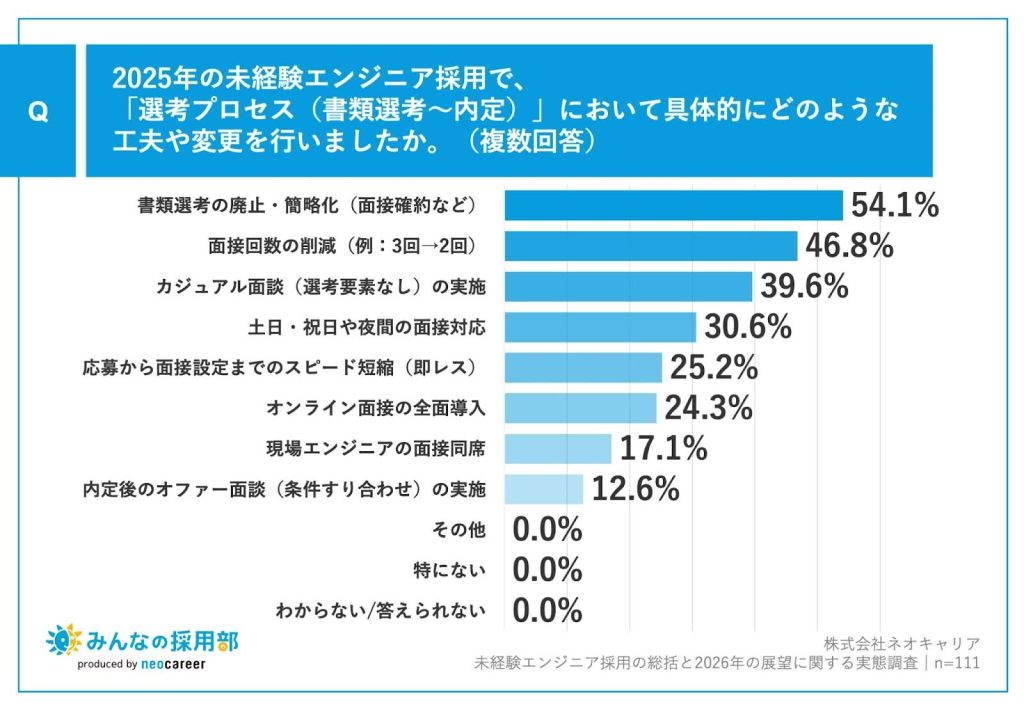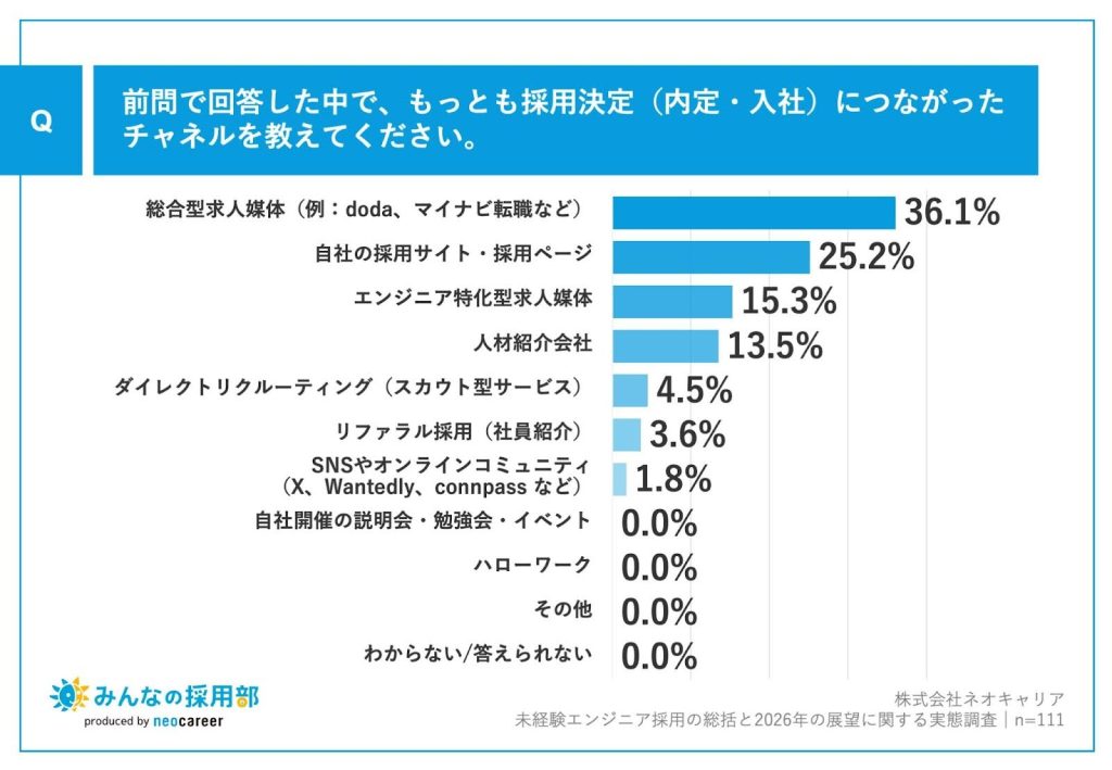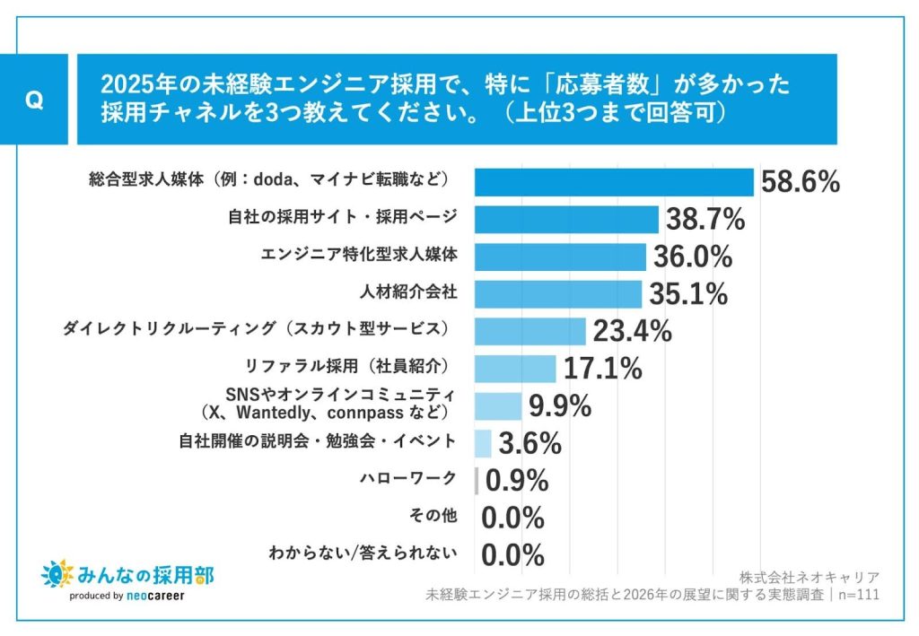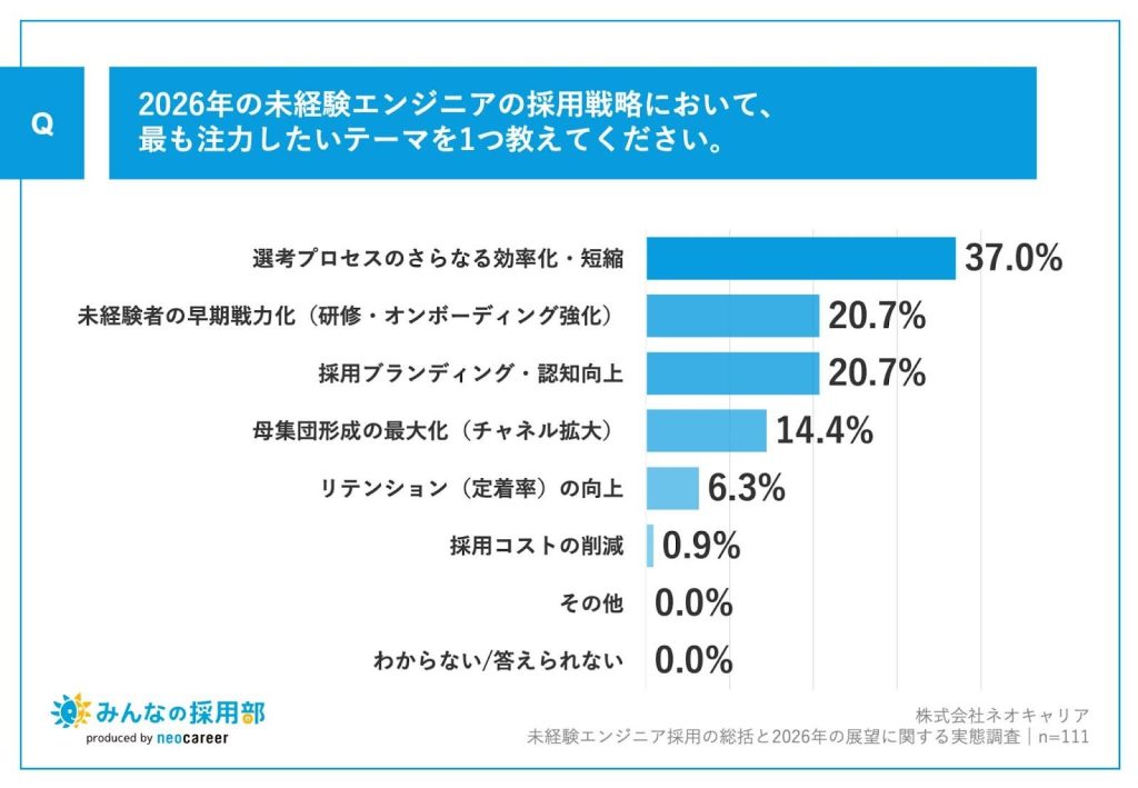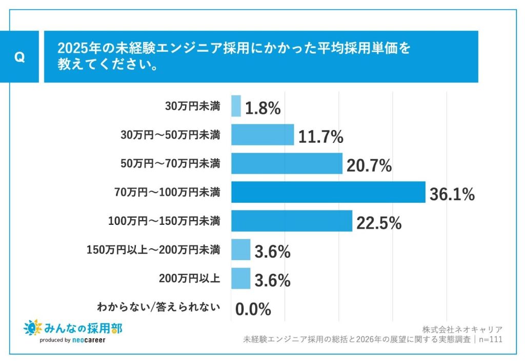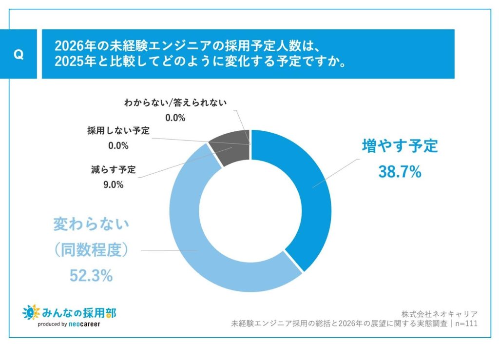 株式会社ネオキャリア(本社:東京都新宿区 代表取締役CEO:西澤 亮一、以下「ネオキャリア」)が運営する、企業の採用活動を包括的に支援する人材サービスの総合代理店「みんなの採用部」(https://www.neo-career.co.jp/humanresource/)は、2025年に10名以上の未経験エンジニアを採用した採用責任者・担当者111名(111社)を対象に、「未経験エンジニア採用の総括と2026年の展望」に関する実態調査を実施いたしました。