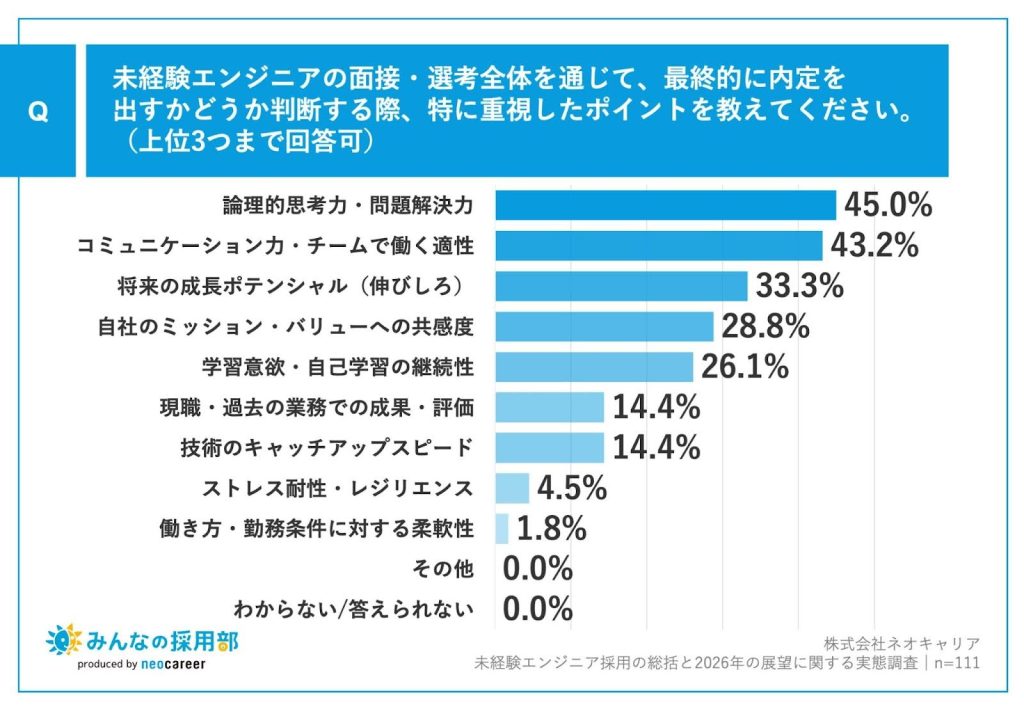 未経験エンジニアの面接・選考全体を通じて、最終的に内定を出すかどうか判断する際に重視したポイントを尋ねたところ、「論理的思考力・問題解決力」が45.0%で最多となりました。次いで、「コミュニケーション力・チームで働く適性」が43.2%、「将来の成長ポテンシャル(伸びしろ)」が33.3%という結果となりました。