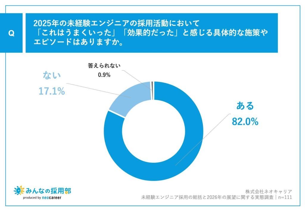 2025年の未経験エンジニアの採用活動において、「これはうまくいった」「効果的だった」と感じる具体的な施策やエピソードがあるか尋ねたところ、「ある」と回答した企業は82.0%にのぼりました。一方で、「ない」は17.1%という結果となりました。