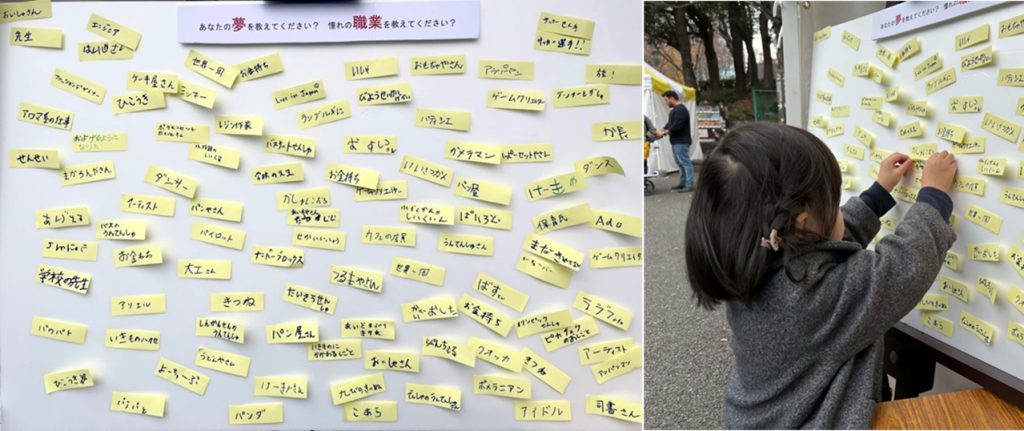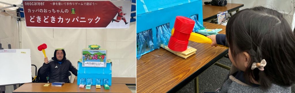 当社は、今年で4回目の出展となり「環境×キャリア支援」をテーマに子どもたちの将来の夢や憧れの職業を書いてボードに貼ってもらう企画と、使用済みの牛乳パックや段ボールを再利用して制作した“リサイクルゲームコーナー”としてブースを実施しました。